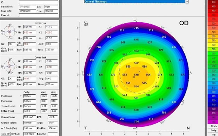 Misurazione dello spessore corneale, essenziale prima di un intervento laser o nella gestione del glaucoma.